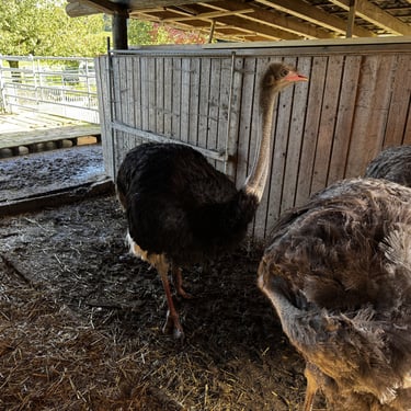 Then there are the three ostriches: two females and a smaller male. Their size difference doesn’t diminish their charm — they’re friendly, playful, and curious, always peering at visitors with their big eyes. We learned that ostriches swallow small stones to help them digest their food. They also have a unique inner eyelid, much like cats, that protects and moistens their eyes.